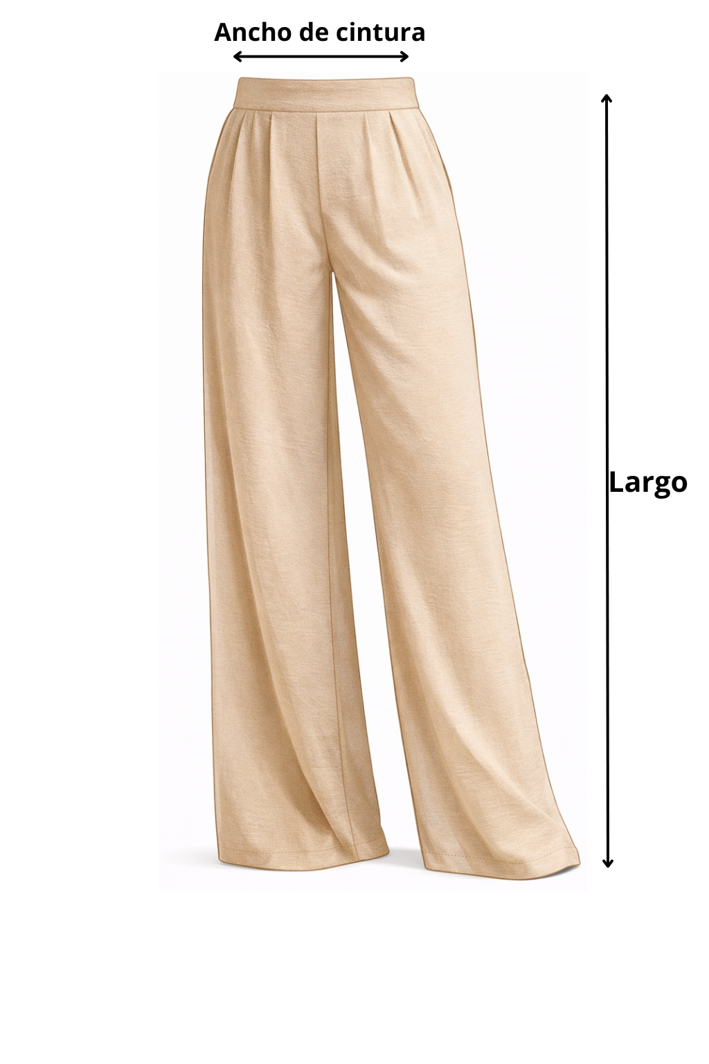 De corte palazzo, presenta una silueta amplia que estiliza la figura y aporta comodidad. Es un pantalón fácil de combinar con blusas, tops o camisas, perfecto tanto para el día como para ocasiones más formales según el look que elijas.